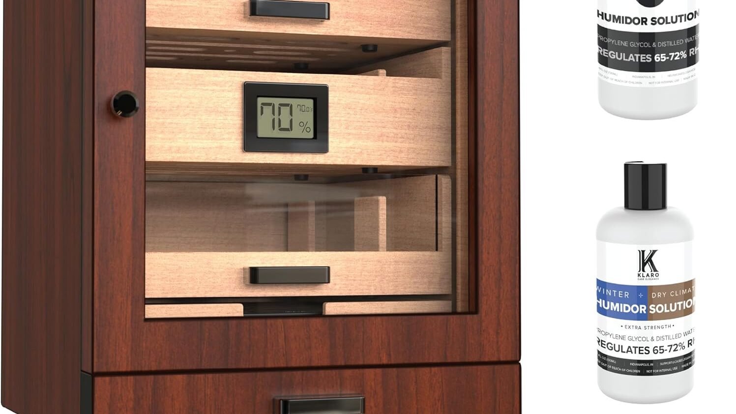 En mi caso, el armario incorpora higrómetro, termómetro y humidificador integrados. Para un coleccionista, esto da tranquilidad. Solo hay que cerciorarse de que la humedad relativa esté entre 65–72% y la temperatura ideal entre 18–21 °C.